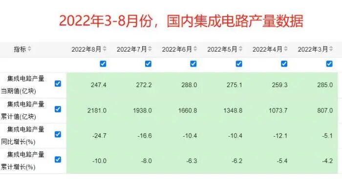 不过到了2022年,形势就有一点逆转了,一直持续增长的国产芯片产量,出了负增长,并且是连续8个月的负增长。