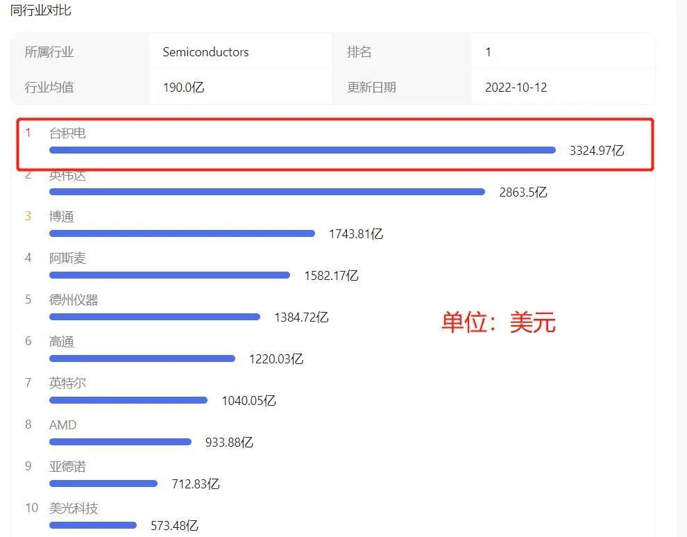 事实上,在美国资本市场上,台积电早已是一哥了,如下图所示,截止至12日,台积电市值高达3325亿美元,超过英伟达、博通、ASML等等,稳居第一。