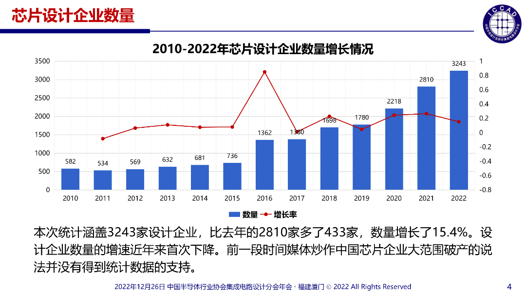数据显示,截止至目前,国内一共有IC设计企业3243家,比去年的2810家多了433家,数量增长了15.4%,而相比前年的2218家,增加了1025家。