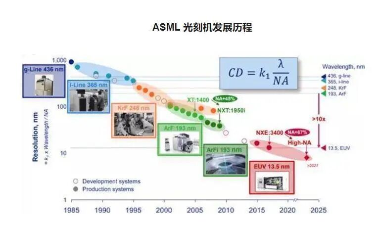 事实上,从光刻机诞生到现在的EUV光刻机,其实已经经历了6代,这6代分别是g线、i线、KrF、ArF、ArFi、EUV。