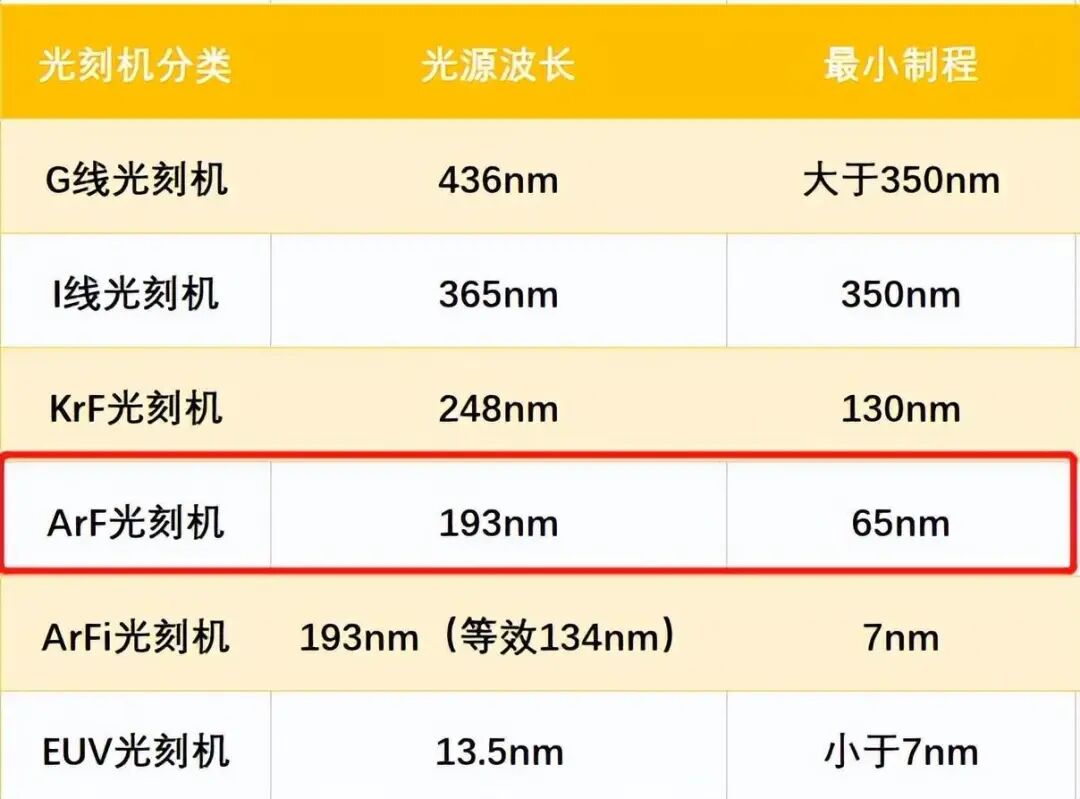 目前上海微电子的光刻机,采用的就是193nm波长光源的DUV光刻机,但是介质是空气。下一步理论上要实现浸润式光刻机,即虽然还是193nm波长的光刻机,但实际等效于143nm。