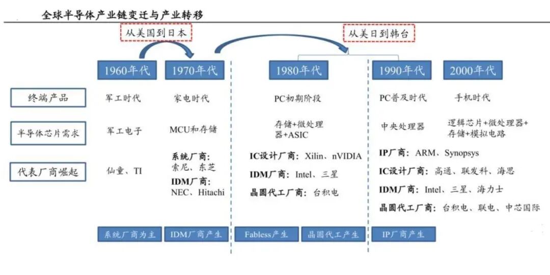 后来美国坐不住了,出手干预,废了日本半导体的武功。于是在20世纪90年代进行了第二次转移,从美国、日本转移至韩国、中国台湾,也就有了三星、台积电的崛起。