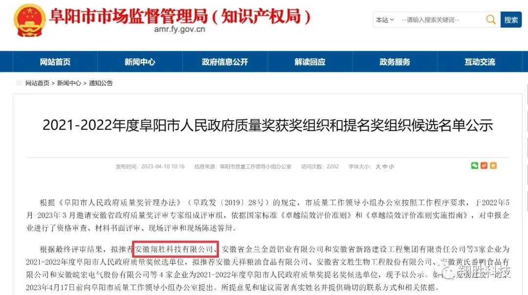 政府质量奖是阜阳市政府设立的最高质量荣誉奖,市质量工作领导小组办公室根据《阜阳市人民政府质量奖管理办法》的程序和要求,邀请安徽省政府质量奖评审专家组成评审组,对申报企业进行了资格审查、材料书面评审、现场评审和现场陈述答辩,最终评选出安徽翔胜科技有限公司等3家企业为2021-2022年度阜阳市人民政府质量奖获得单位。