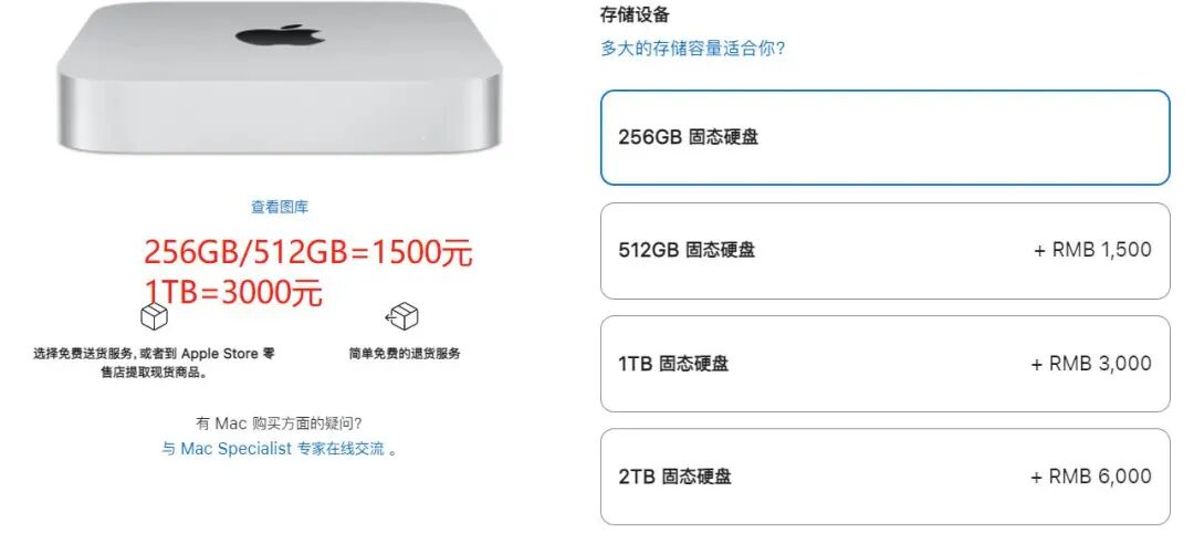 同样拿火爆的Mac Mini举例,256GB升级成512GB,要加1500元,而1TB升级成2TB,要加3000元。算下来是256GB/512GB=1500元,而1TB=3000元。