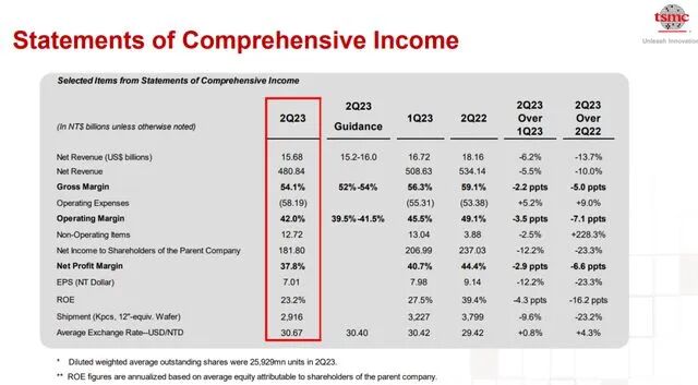 数据显示,台积电Q2营收同比下滑10%,环比下滑5.5%,净利润同比下滑23.3%,环比下滑12.2%,毛利率降至54.1%。
