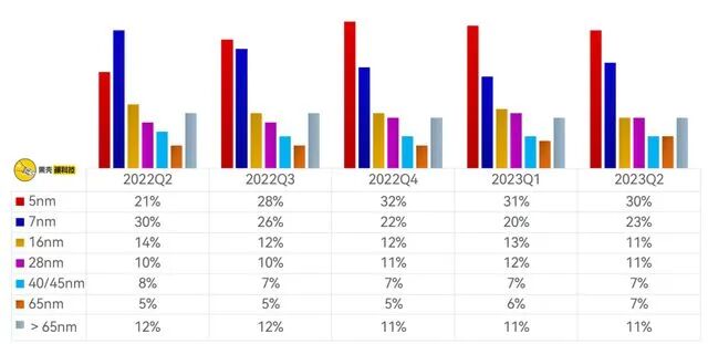 反倒7nm、65nm这两个工艺的占比提升了,说明最高端的5nm工艺,以及最为稳定的28nm这样的工艺,都出现了订单不足的问题。