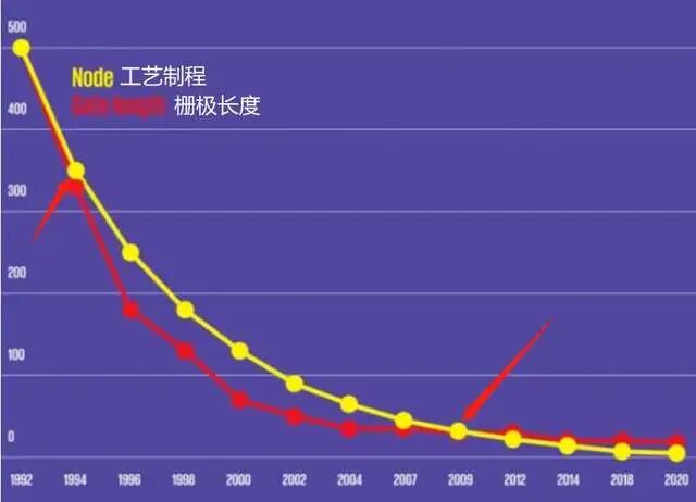 但后来,随着工艺越来越先进,栅极长度不能同步缩小,栅级长度和工艺就不对应了,在1994年-2008年间,是栅级长度小于芯片工艺, 2008年之后,是栅级长度大于芯片工艺。