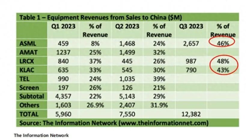 特别是荷兰的ASML,中国贡献了46%的营收,美国LRCX 泛林半导体来自于中国的贡献占比高达48%、KLAC(科磊)来自于中国的营收占比高达43%。