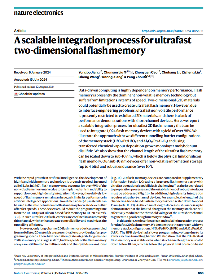 大数据与人工智能时代对数据存取性能提出了极致要求,而传统存储器的速度与功耗已成为阻碍算力发展的“卡脖子”问题之一。今年4月,周鹏-刘春森团队于《自然》(Nature)期刊提出“破晓”二维闪存原型器件,实现了400皮秒超高速非易失存储,是迄今最快的半导体电荷存储技术,为打破算力发展困境提供了底层原理。
