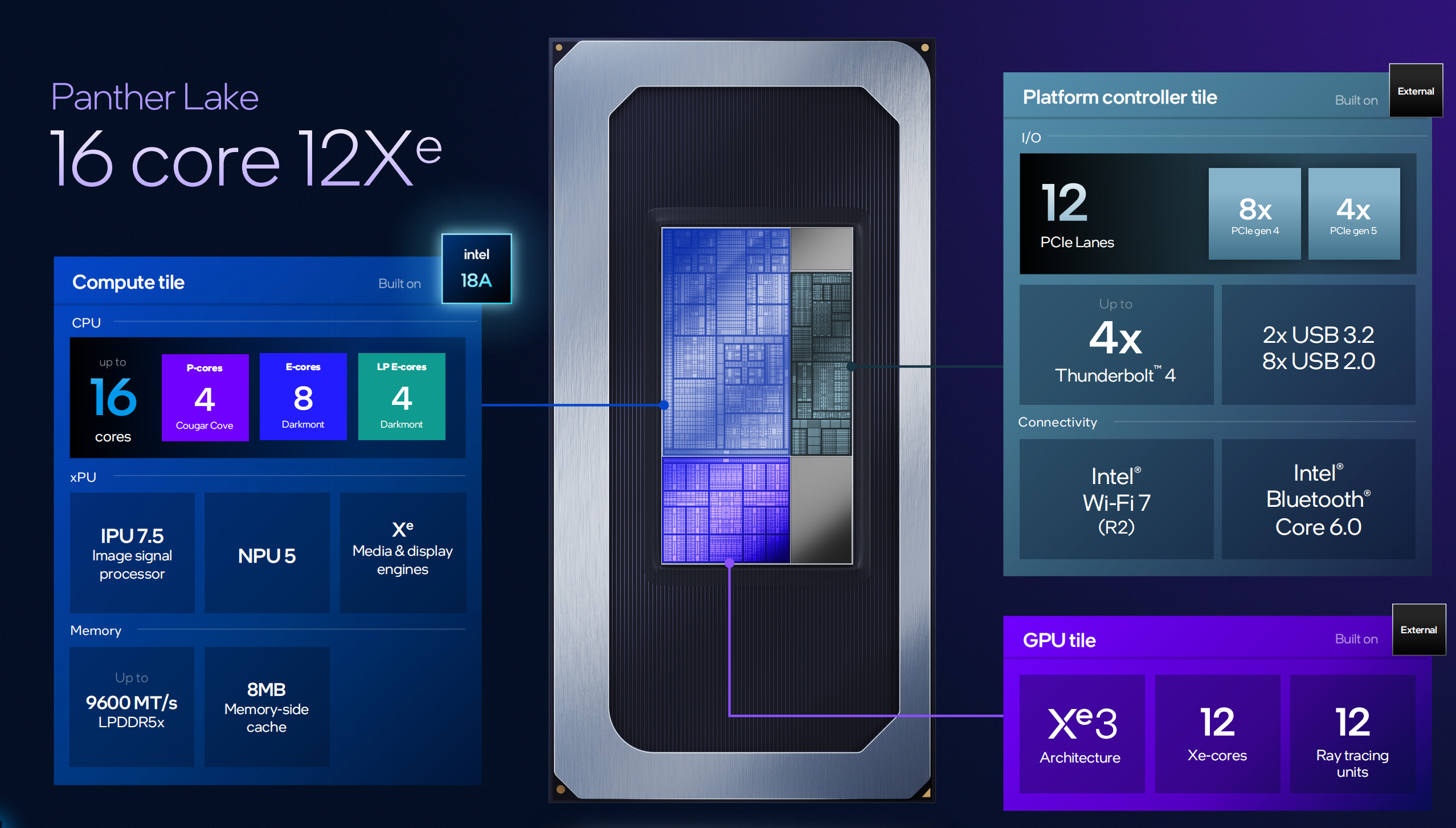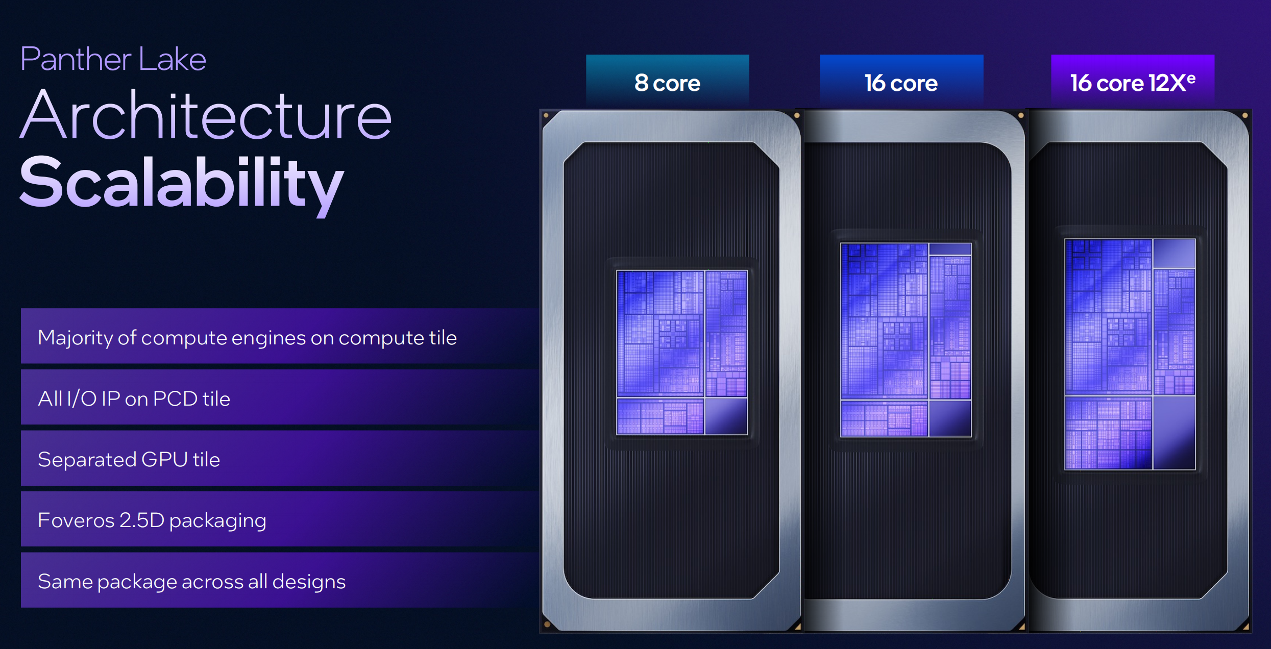 Panther Lake继承了前两代Lunar Lake和Arrow Lake在架构方面的创新,以及所带来的能效和性能上的表现,英特尔为Panther Lake在架构设计上赋予了极大的灵活度。
