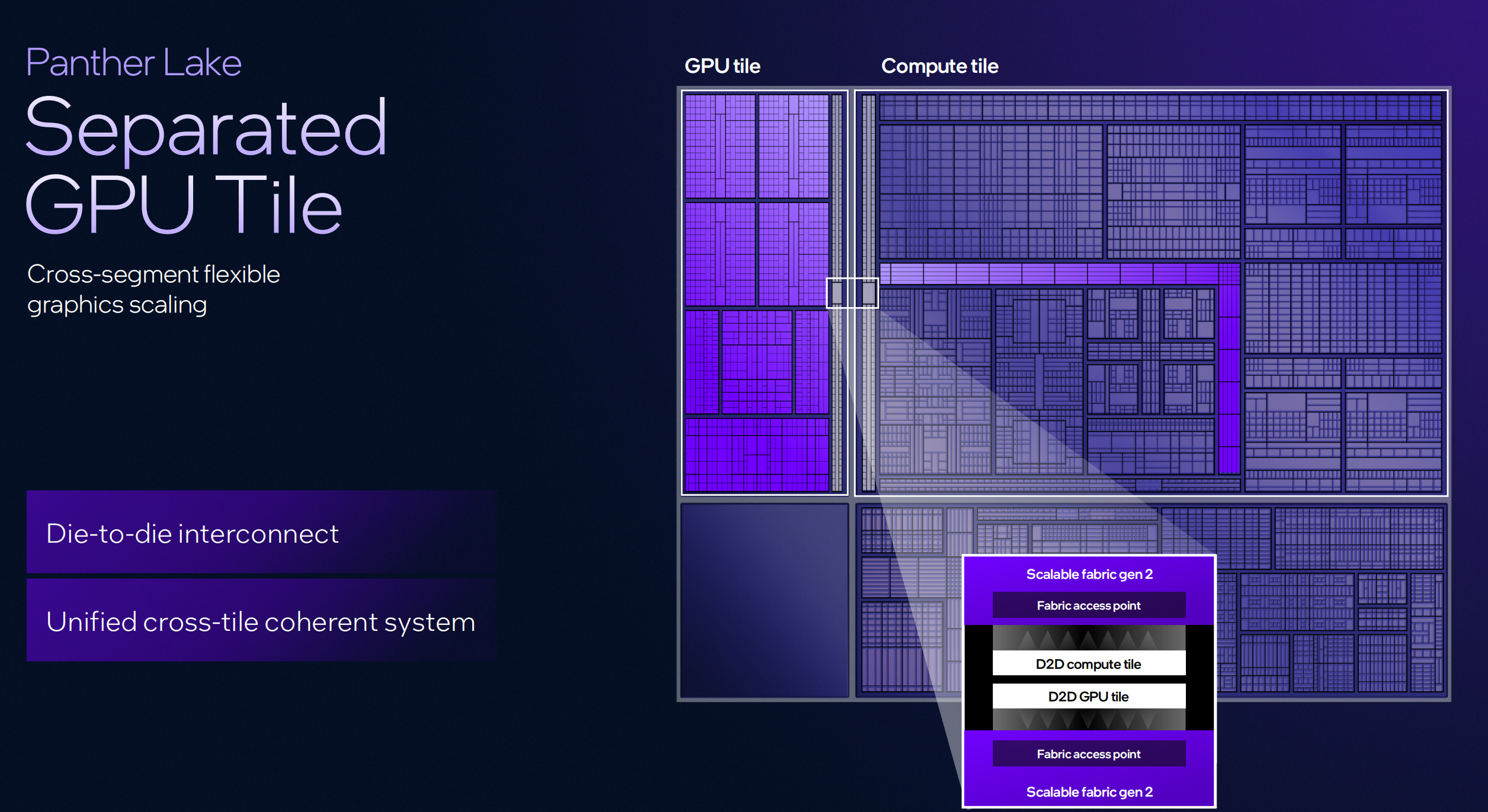 Panther Lake继承了Arrow Lake上独立GPU模块的设计思路(Lunar中GPU位于计算模块中),计算模块与GPU模块通过D2D连接,这为GPU的Xe内核的更新以及数量增加提供便利,也有利于未来实现跨厂商的GPU IP模块集成。