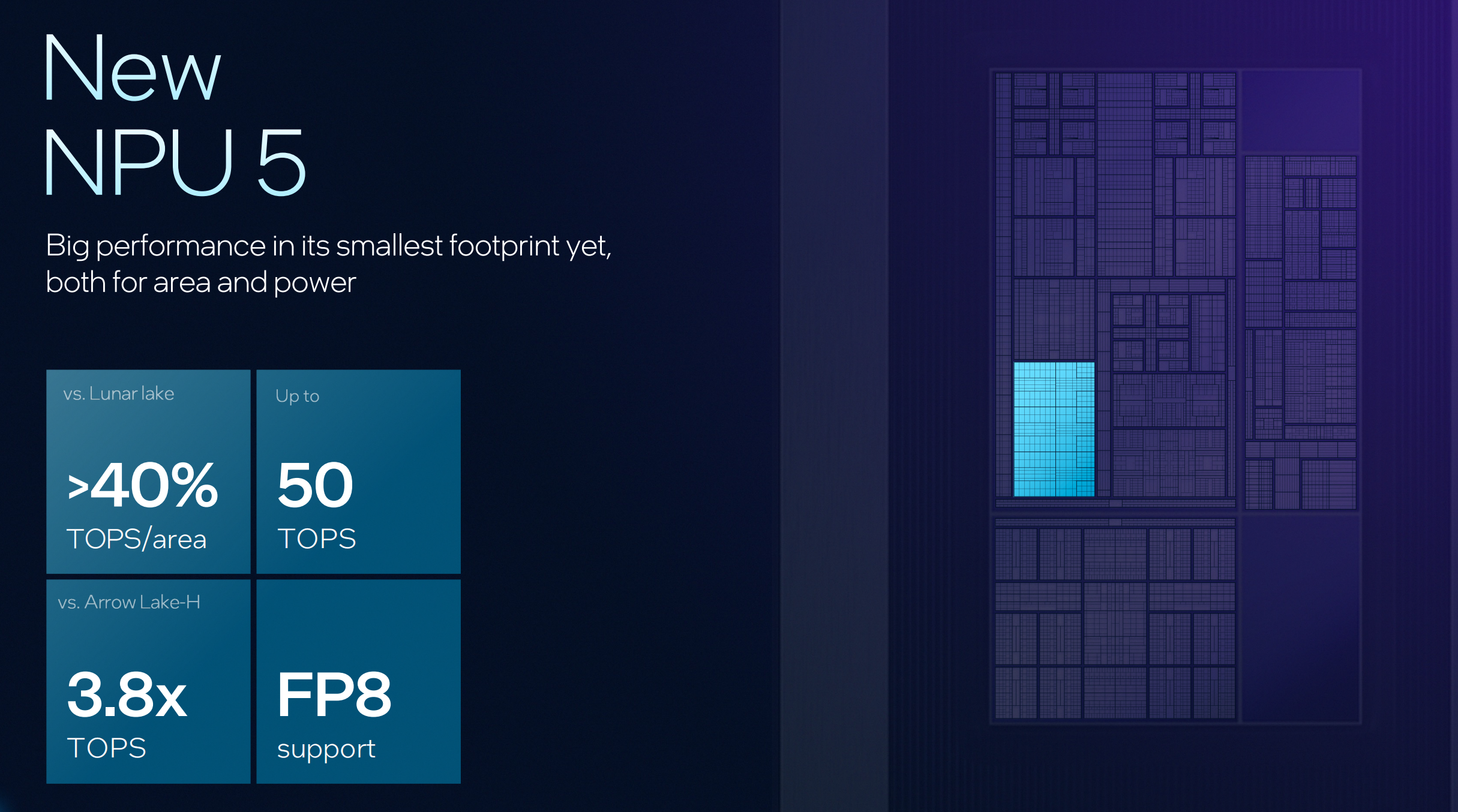 Panther Lake集成了全新的NPU5,架构目标是面积效率以及为最新的负载优化。