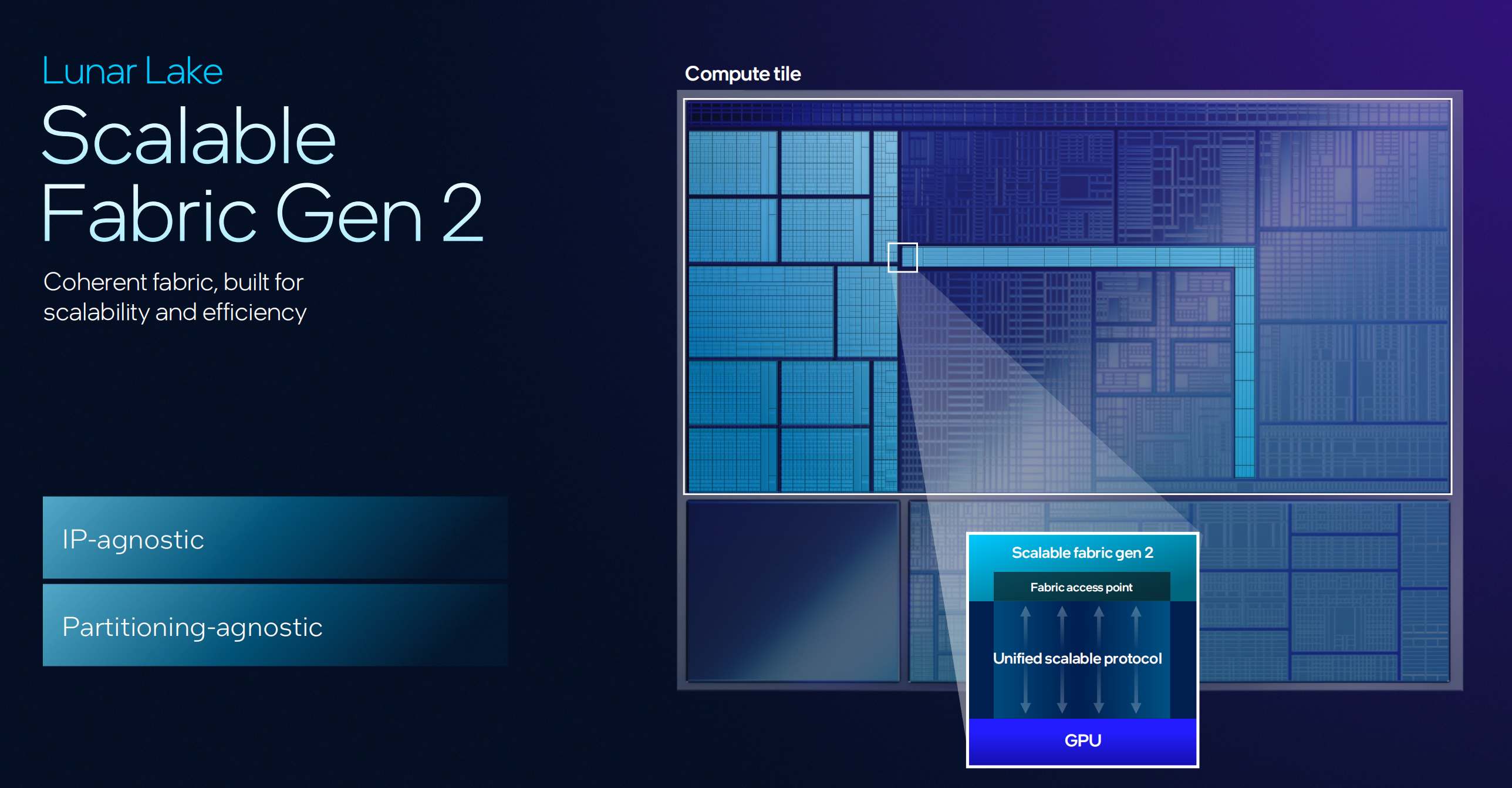Fabric Gen2是英特尔在Lunar lake上推出的新一代片内部互联技术,主要用于连接计算模块(Compute Tile)与平台控制模块(Platform Controller Tile),以及模块内部各功能单元(如 CPU、GPU、NPU),其核心目标是在低功耗与高效通信之间取得平衡。