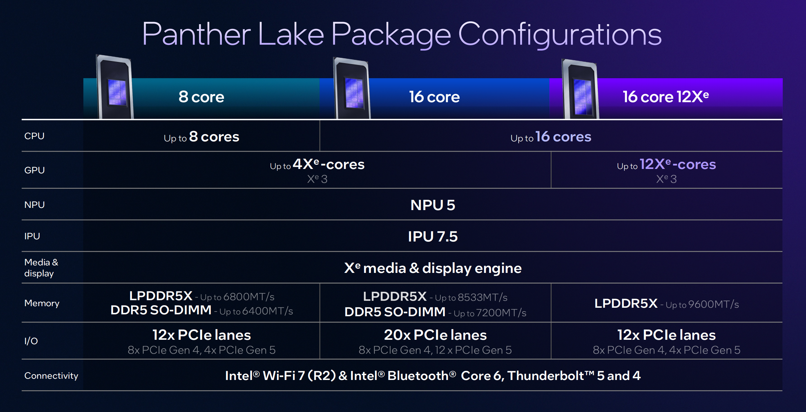此次推出的Panther Lake系列包括三款不同的配置,其中8核、16核版本最高支持4核Xe GPU,而16核(12Xe)版本最高支持12个Xe核。
