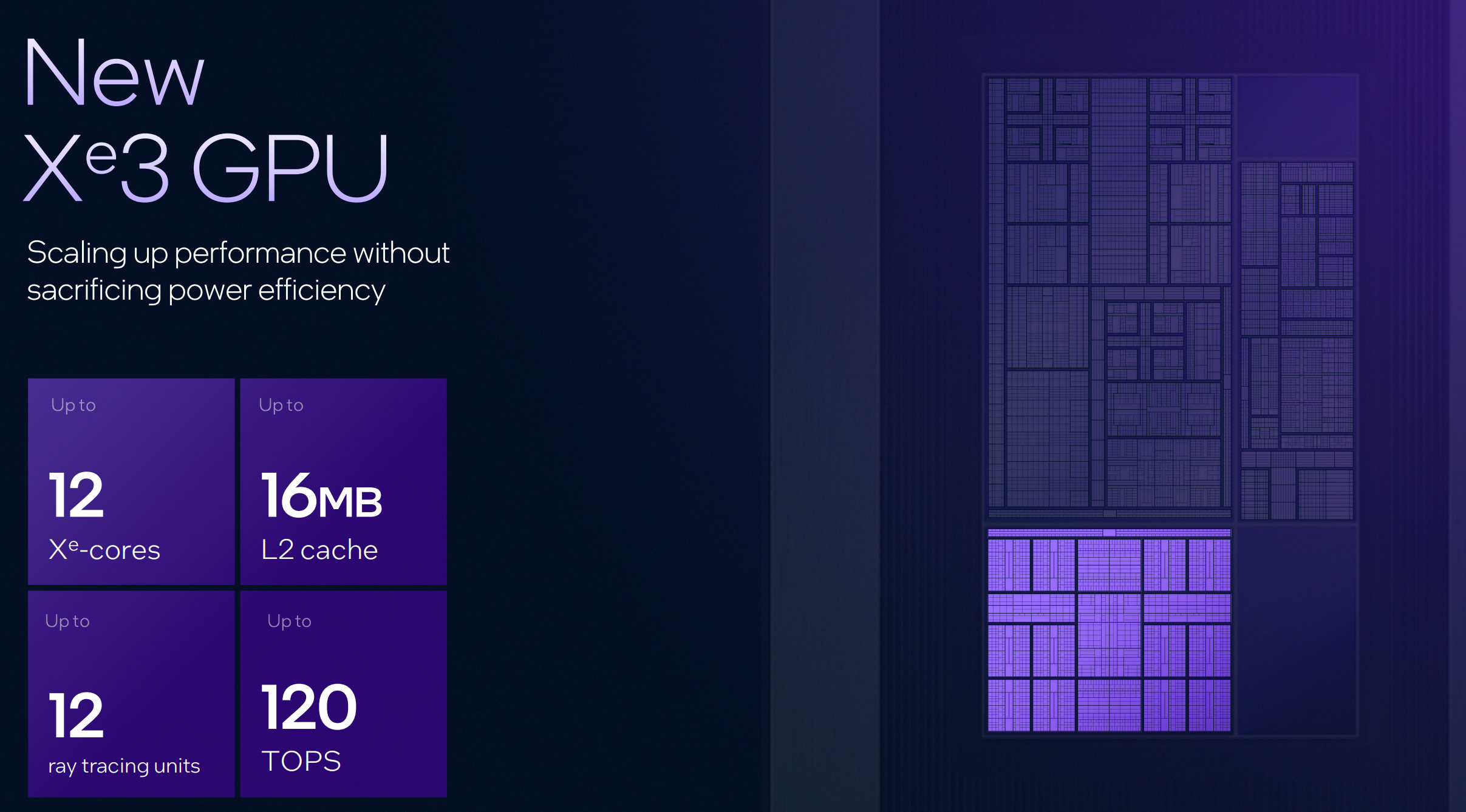 全新的Xe3 GPU是Panther Lake的一大亮点,Panther Lake最多支持12个Xe3核心,最大16MB的L2缓存,最多12个光追单元以及120TOPS的算力。