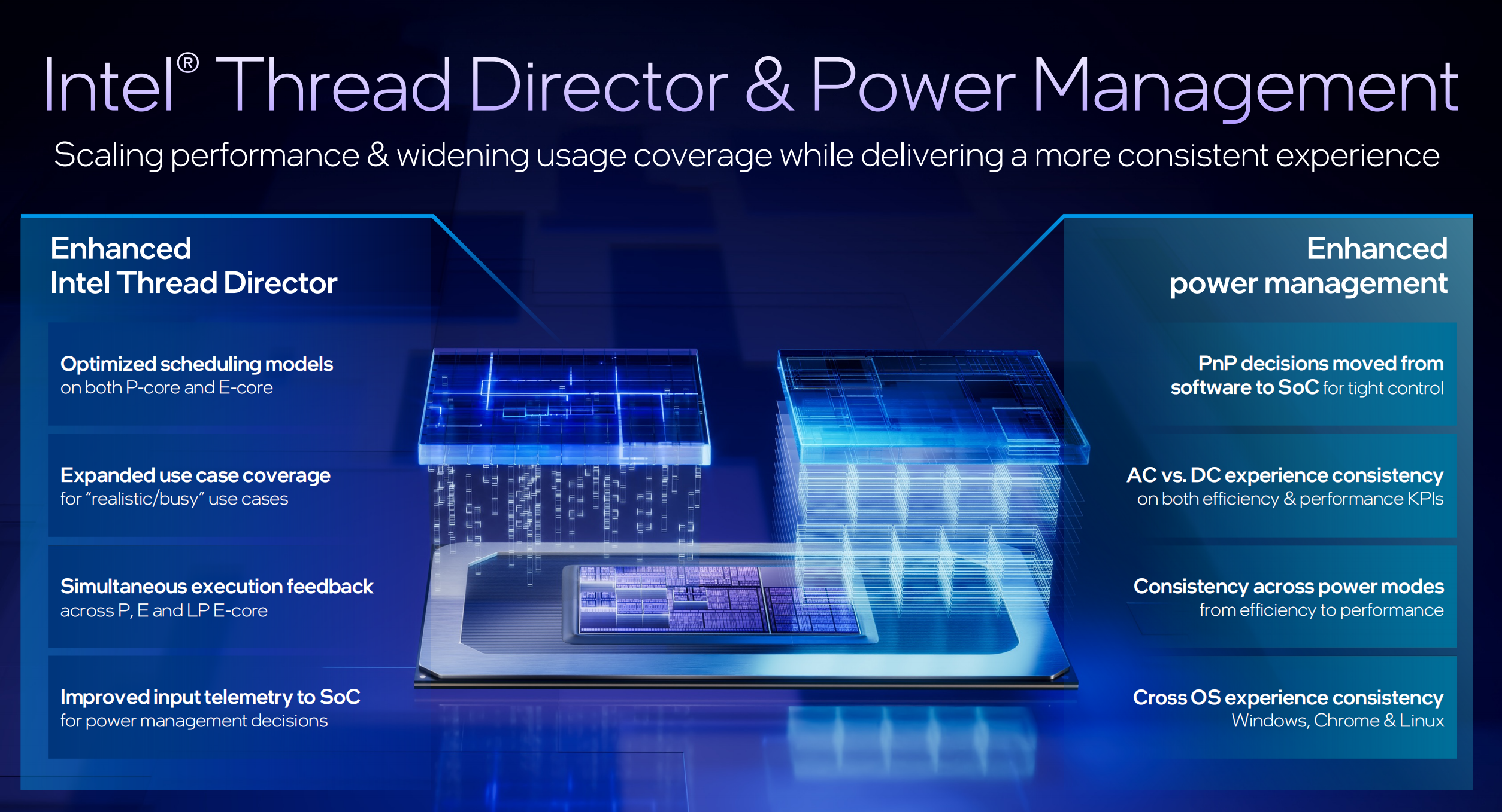 除了硬件层面外,在软件方面,Panther Lake采用了进一步优化的硬件线程调度器,其扮演着连接操作系统和硬件之间的桥梁角色,能够根据实时监控到的指令集,对CPU上的所有线程进行分类,上报给操作系统,结合OS控制区的切换,会将不同工作负载放在不同的核心,在办公、游戏、加电或者不插电等场景下,对应算法不同。