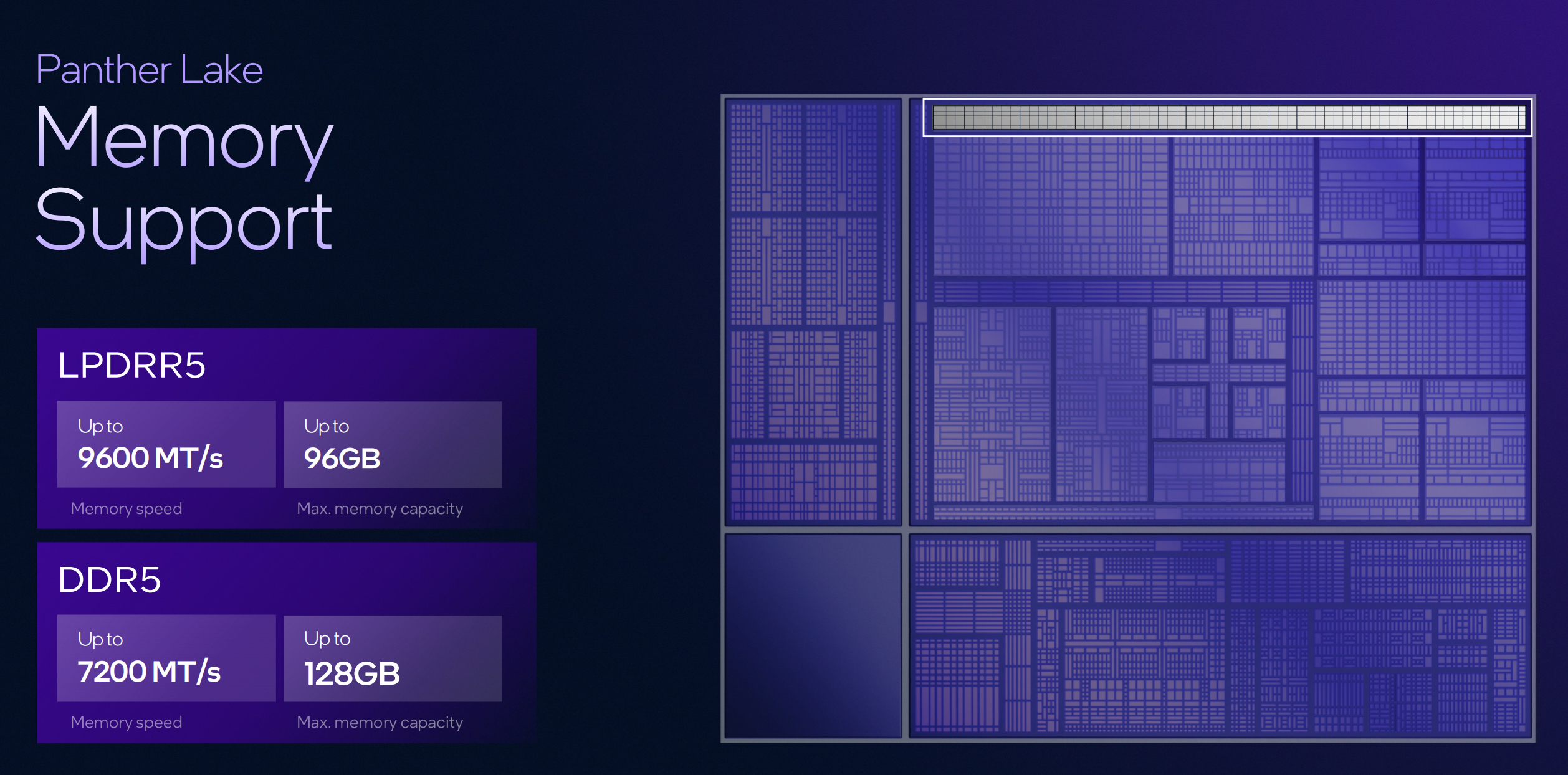在存储方面,采用板载内存的形式,Panther Lake支持LPDDR5X最高9600MT/s以及最高96GB的容量,DDR5最高支持7200MT/s以及最高128GB的容量。