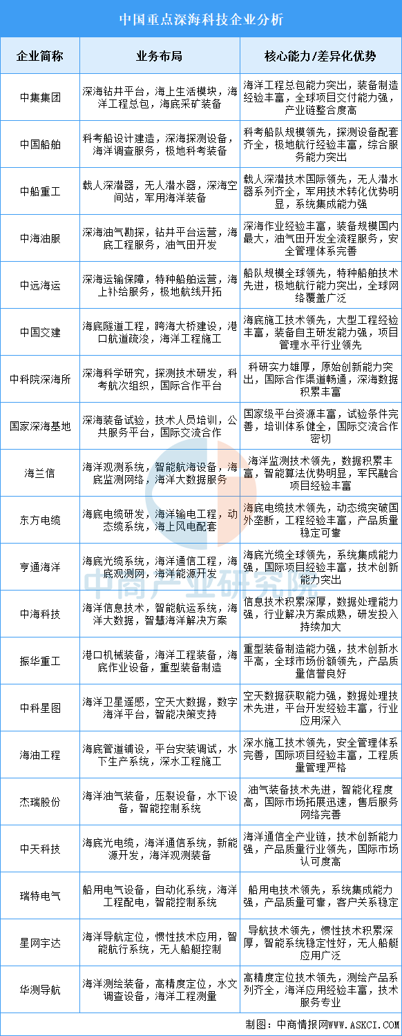 中商情报网讯:行业正从装备制造向资源勘探开发、生态环境监测等全产业链拓展,技术竞争聚焦深海装备智能化、极端环境适应性和资源开发利用效率,应用场景从近海走向深远海综合开发。中集集团以深海装备总包能力主导市场;中国船舶借科考船队规模优势构建综合服务能力;中船重工依托载人深潜技术突破占据深潜装备制高点。