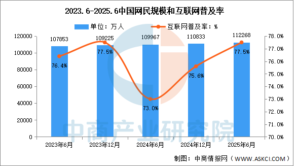 中商情报网讯:截至2025年6月,我国网民规模达11.23亿人,较2024年12月增长1436万人,互联网普及率达79.7%,较2024年12月提升1.1个百分点。