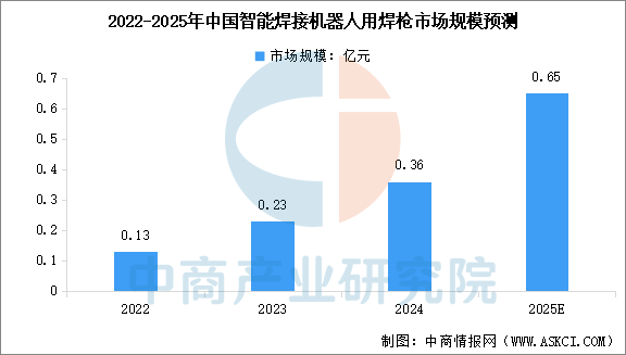 焊枪是执行焊接操作的末端工具。它负责传导焊接电流、输送焊丝,并喷射保护气体,以形成稳定的电弧和熔池,最终形成焊缝。中商产业研究院发布的《2025-2030年中国智能焊接机器人市场调查与行业前景预测专题研究报告》显示,2024年中国智能焊接机器人用焊枪的市场规模为0.36亿元。中商产业研究院分析师预测,2025年中国智能焊接机器人用焊枪的市场规模将达到0.65亿元。