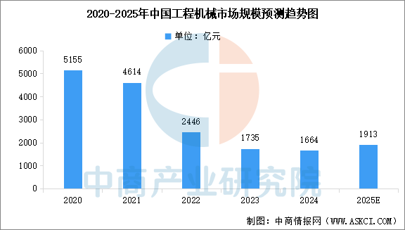 中国工程机械行业具有强周期性,2022年至2023年经历了市场调整期,行业需求受压。2024年下半年以来,市场稳定回暖,挖掘机、起重机械等主要设备销量环比增长,行业进入新一轮增长周期。中商产业研究院发布的《2025-2030年中国工程机械产业发展趋势及投资风险研究报告》显示,2024年中国工程机械市场规模为1664亿元。中商产业研究院分析师预测,2025年中国工程机械市场规模将增至1913亿元。