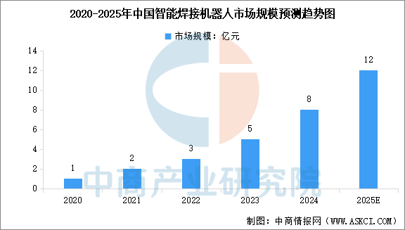 焊接机器人技术正经历从"机械化"到"智能化"的深刻变革,中国智能焊接机器人市场呈现高速增长态势。中商产业研究院发布的《2025-2030年中国智能焊接机器人市场调查与行业前景预测专题研究报告》显示,中国智能焊接机器人市场规模从2020年的1亿元扩大至2024年的8亿元,期间复合年增长率为85.7%。中商产业研究院分析师预测,2025年中国智能焊接机器人市场规模将达到12亿元。