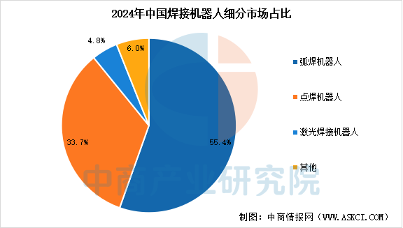 按焊接工艺分类,焊接机器人通常包括弧焊机器人、点焊机器人、激光焊接机器人等。中商产业研究院发布的《2025-2030年中国智能焊接机器人市场调查与行业前景预测专题研究报告》显示,2024年中国弧焊机器人市场规模为46亿元,占比最大,达到55.4%,点焊机器人和激光焊接机器人市场规模分别为28亿元和4亿元,分别占比33.7%和4.8%。