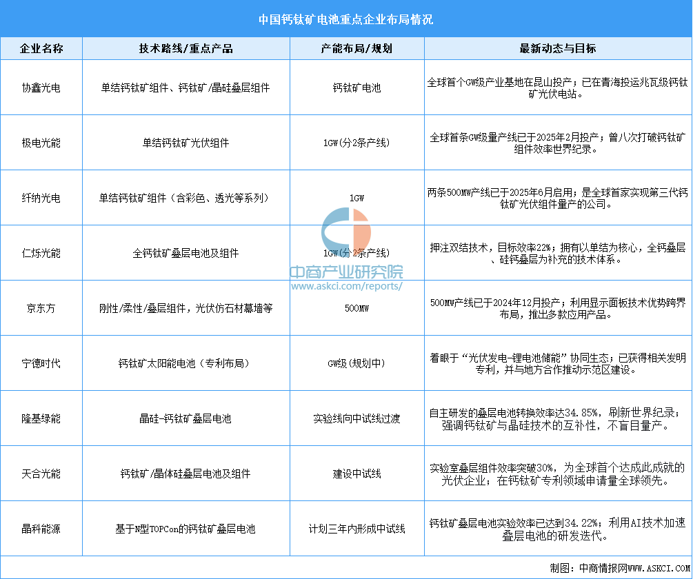 钙钛矿电池领域的竞争格局已初步形成,呈现出专业初创公司引领量产进程、跨界巨头凭借技术协同与生态构建切入、传统光伏巨头聚焦叠层技术的多元化布局态势。单结钙层电池主要由协鑫光电、纤纳光电、极电光能等专业钙钛矿企业推动,致力于纯钙钛矿技术的产业化。钙钛矿-晶硅叠层电池是目前许多传统光伏巨头选择的方向,它们利用自身在晶硅领域深厚的技术积累和产业优势,通过在现有晶硅电池上叠加钙钛矿层来进一步提升效率极限,被视为突破晶硅单结电池效率极限的主流技术方案。