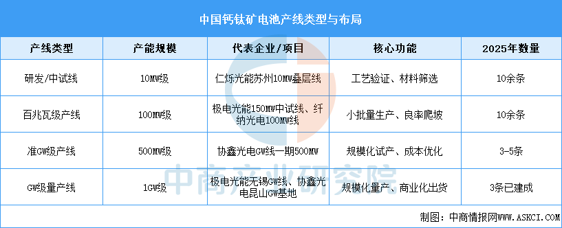 钙钛矿电池产线按产能规模分为研发/中试线、百兆瓦级、准GW级和GW级四个层级,代表企业包括极电光能、协鑫光电、纤纳光电、仁烁光能等。截至2025年,行业已建成3条GW级量产线,其中极电光能全球首条GW级产线已投产,协鑫光电GW级叠层基地部分启用,纤纳光电GW级产线预计2025年下半年投产,覆盖单结及叠层技术路线,宁德时代等跨界企业亦在筹备GW级产线,2026年仁烁光能等厂商有望跟进。