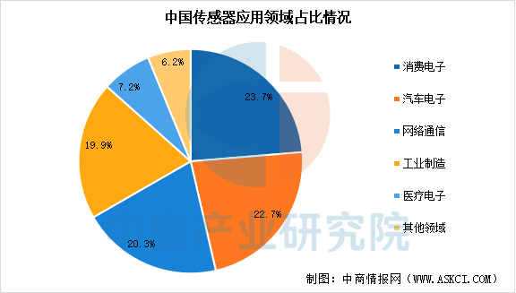 中国传感器应用市场行业结构呈现多元化分布,其中消费电子领域以862.1亿元的市场规模位居第一,占比23.7%,是最大的应用市场;汽车电子领域市场规模827.9亿元,占比22.7%,排名第二;网络通信领域以739.8亿元的规模位列第三,占比20.3%;工业制造领域市场规模724.2亿元,占比19.9%;医疗电子领域市场规模261.0亿元,占比7.2%;其他领域市场规模229.7亿元,占比6.2%。