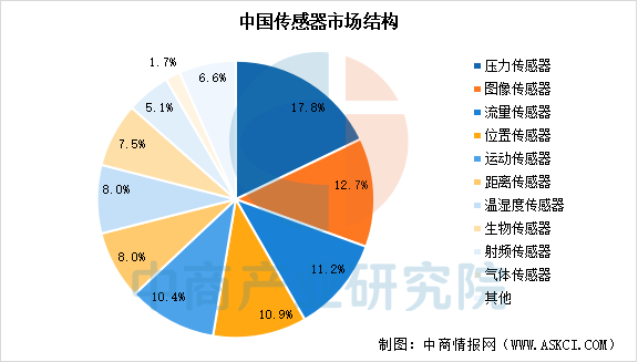 传感器细分品类极为丰富,涵盖温度、压力、湿度、气体、位置等多种类型,每类又因原理、材料、应用场景不同衍生出数十种细分品类。中商产业研究院发布的《2025-2030年中国智能传感器行业前景与市场趋势洞察专题研究报告》显示,中国传感器市场中,占比最大的是压力传感器,市场规模为650.5亿元,占比17.8%。其次是图像传感器、流量传感器、位置传感器和运动传感器,市场占比分别为12.7%、11.2%、10.9%、10.4%。