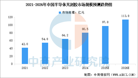 目前国内在高端ArF和EUV光刻胶领域仍在努力攻关。中商产业研究院发布的《2025-2030全球及中国光刻胶和光刻胶辅助材料行业发展现状调研及投资前景分析报告》显示,2024年中国光刻胶市场规模约为80.5亿元,同比增长25.39%。中商产业研究院分析师预测,2025年中国光刻胶市场规模将达到97.8亿元,2026年市场规模将达到113.8亿元。