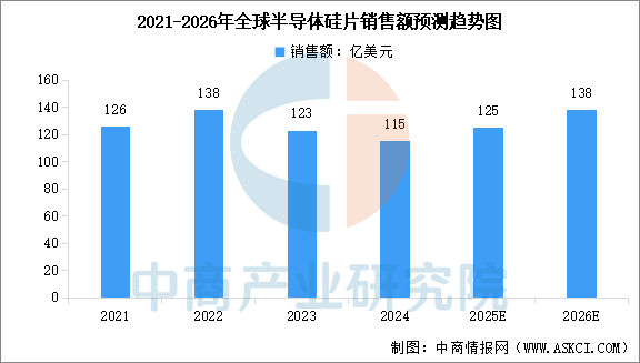 半导体硅片是制造MEMS和芯片的基础衬底材料。中商产业研究院发布的《2025-2030年全球及中国半导体硅片产业发展趋势分析及投资风险预测报告》显示,2024年全球半导体硅片销售额约115亿美元,同比减少6.5%,创近年来新低。受益于存储、AI以及大数据相关应用的强劲驱动,半导体硅片市场有望在2025年出现复苏,恢复增长趋势。中商产业研究院分析师预测,2025年全球半导体硅片销售额将达到125亿美元,2026年销售额将达到138亿美元。