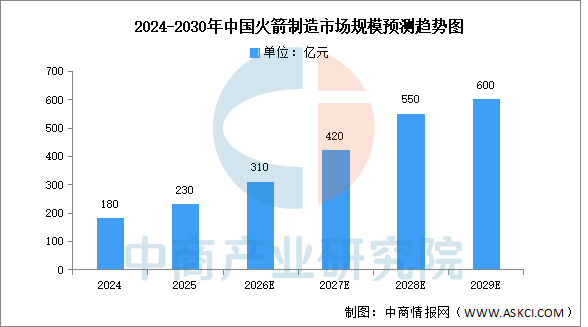 中商产业研究院发布的《中国航天器及运载火箭制造产业招商指南》显示,2024年中国商业火箭制造市场规模已突破180亿元,2025年约达230亿元。中商产业研究院分析师预测,到2026年,火箭制造市场规模有望超过300亿元,至2030年将增长至600亿元,占全球商业火箭制造市场的18%左右。