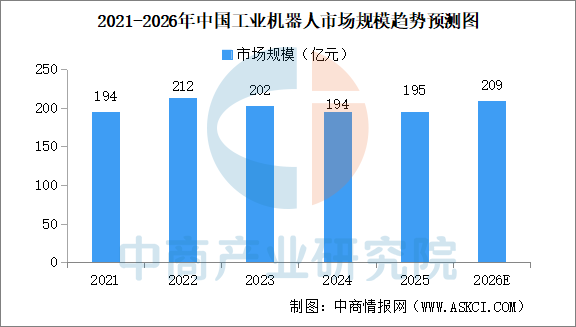 近年来,中国工业机器人市场规模小幅波动。中商产业研究院发布的《2026-2031年中国工业机器人行业深度调查及投融资战略研究报告》显示,中国工业机器人市场规模由2021年的194亿元略微增长至2025年的195亿元,复合年增长率为0.1%,整体上保持大致稳定。中商产业研究院分析师预测,2026年中国工业机器人市场规模将达209亿元。