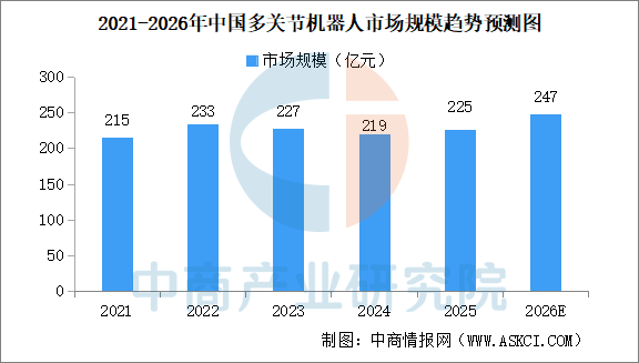 中商情报网讯:多关节机器人指以旋转关节为主要运动单元,通过多个关节的组合实现多自由度空间运动的机器人。其机械结构类似於人类手臂,能够在三维空间内实现灵活的轨迹规划与复杂作业操作,通常为垂直多关节形态。中商产业研究院发布的《2026-2031年中国多关节机器人市场前景及融资战略咨询报告》显示,2025年中国多关节机器人市场规模225亿元,预计2026年中国多关节机器人市场规模247亿元。