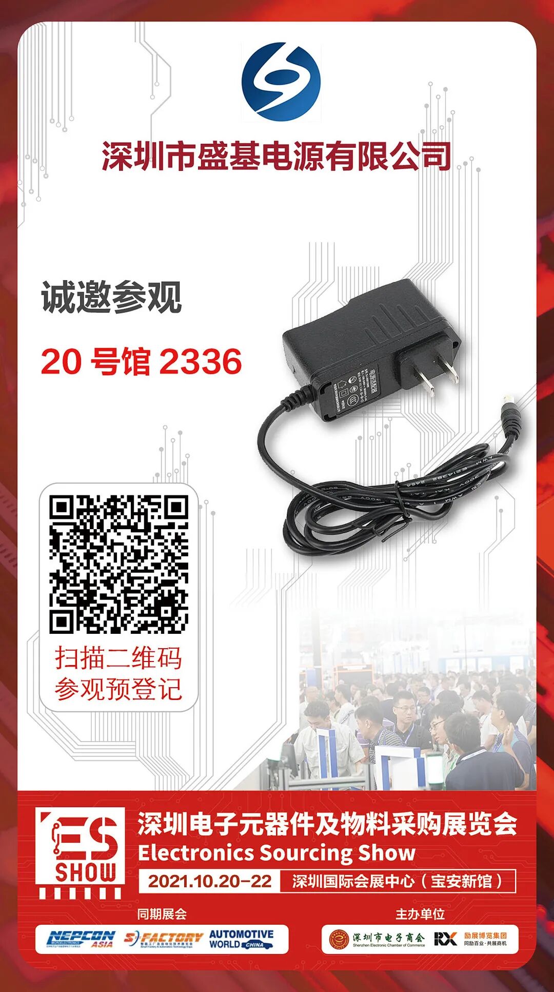 深圳市盛基电源有限公司 深圳市盛基电源有限公司成立于1998年,是一家专业开发、生产电源适配器和开关电源系列的生产型公司,产品广泛应用于网络系统、安防系统、通讯设备、医疗保健产品各类数码视听产品等领域。在科学、完善和检验管理体系控制下,保证了产品的优良性能和质量。连续取得了ISO9001:2008、CCC、UL、FFC、GS、CB、PSE、CE、CUL、ROHS等认证。多年来盛基电源产品以卓越的品质,合理的价格,完善的售前、售后服务,深受海内外客户的好评和众多知名企业的信赖。 参展产品: 参展品牌: 盛基Shengji牌 应用领域: 产品广泛应用于网络系统、安防系统、通讯设备、交通配套设备、医疗保健产品、文体用品、各类数码视听产品等领域 码上登记 2021 深圳电子元器件及物料采购展览会,将于10月20-22日在深圳国际会展中心(宝安)闪亮登场,隆重开幕。深圳市盛基电源有限公司期待你的到来,展位号2336,赶紧收下此邀请函,码上登记,我们不见不散! 坐稳!码上启程,搭乘开往ES SHOW 2021的列车!
