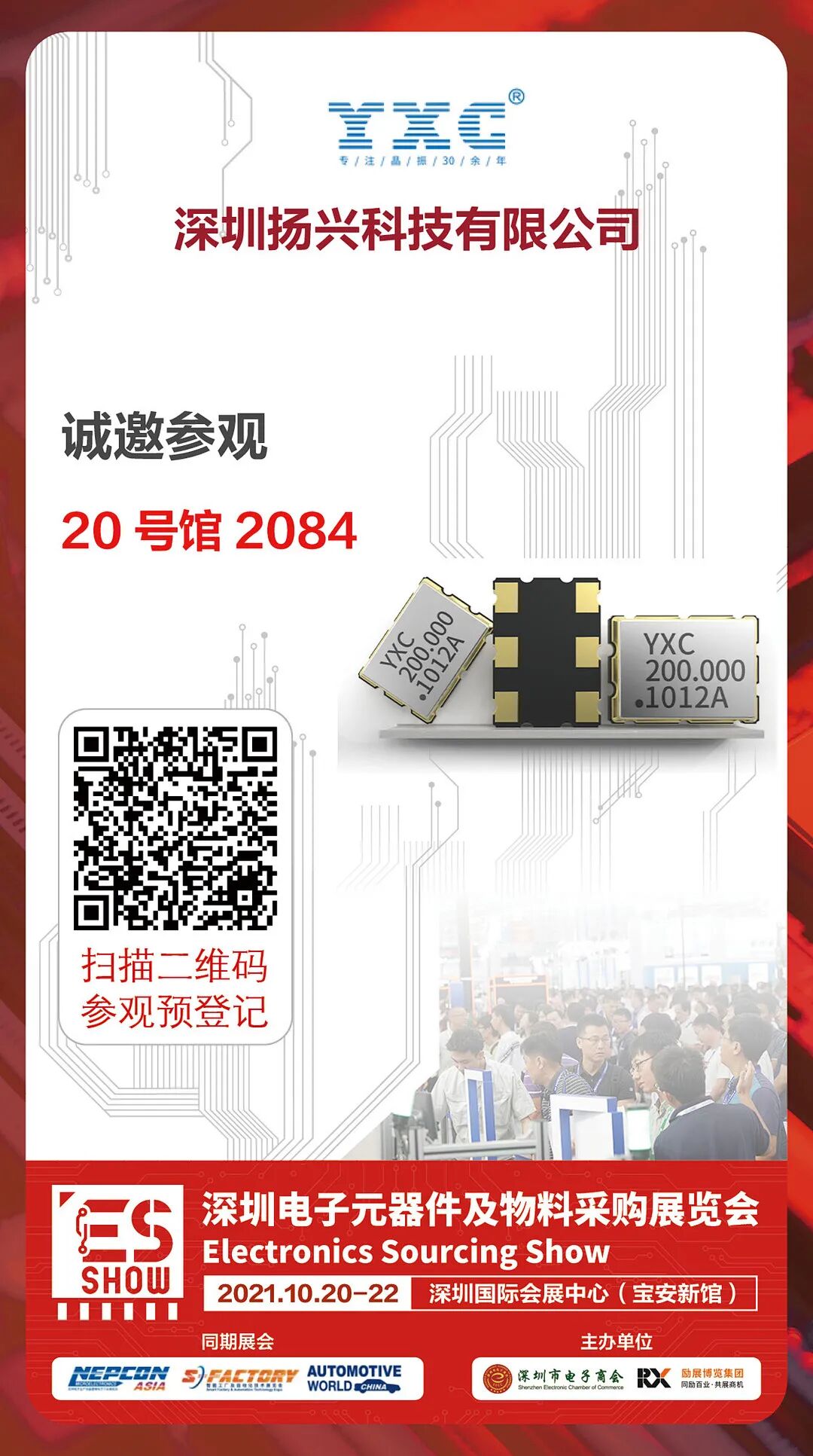 深圳扬兴有限公司 深圳扬兴科技有限公司创立于1986年,是致力于为客户提供频率器件解决方案的国家高新技术企业。公司拥有自主国产品牌YXC,被评为“电子元器件十大品牌””优秀国产品牌,先后斩获专利及荣誉60余项。2018年扬兴科技与台湾博士级导师团队合资控股成立半导体设计公司“深圳星河半导体技术有限公司”,专注晶振电子集成电路、芯片半导体领域的开发与设计。 近年来,扬兴始终致力于以科技创新为基础:为每一个电子产品贡献中国的科技力量;让所有的电子产品变得稳定、高效;让生产厂商获得极致的方案定制体验。目前扬兴科技含研究学者、员工200余人,服务企业5万余家,业务遍及四大洲。面向未来,扬兴的创新将从基于客户需求的技术、产品和解决方案的创新时代,迈向基于愿景驱动的技术发明时代,并坚持与合作伙伴一起建立良性的产业环境,实现社会价值与商业价值共赢,助力民族品牌发展。 参展产品: 码上登记 2021 深圳电子元器件及物料采购展览会,将于10月20-22日在深圳国际会展中心(宝安)闪亮登场,隆重开幕。深圳扬兴科技有限公司期待你的到来,展位号2084,赶紧收下此邀请函,码上登记,我们不见不散! 坐稳!码上启程,搭乘开往ES SHOW 2021的列车!